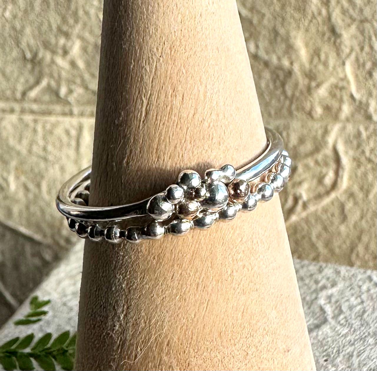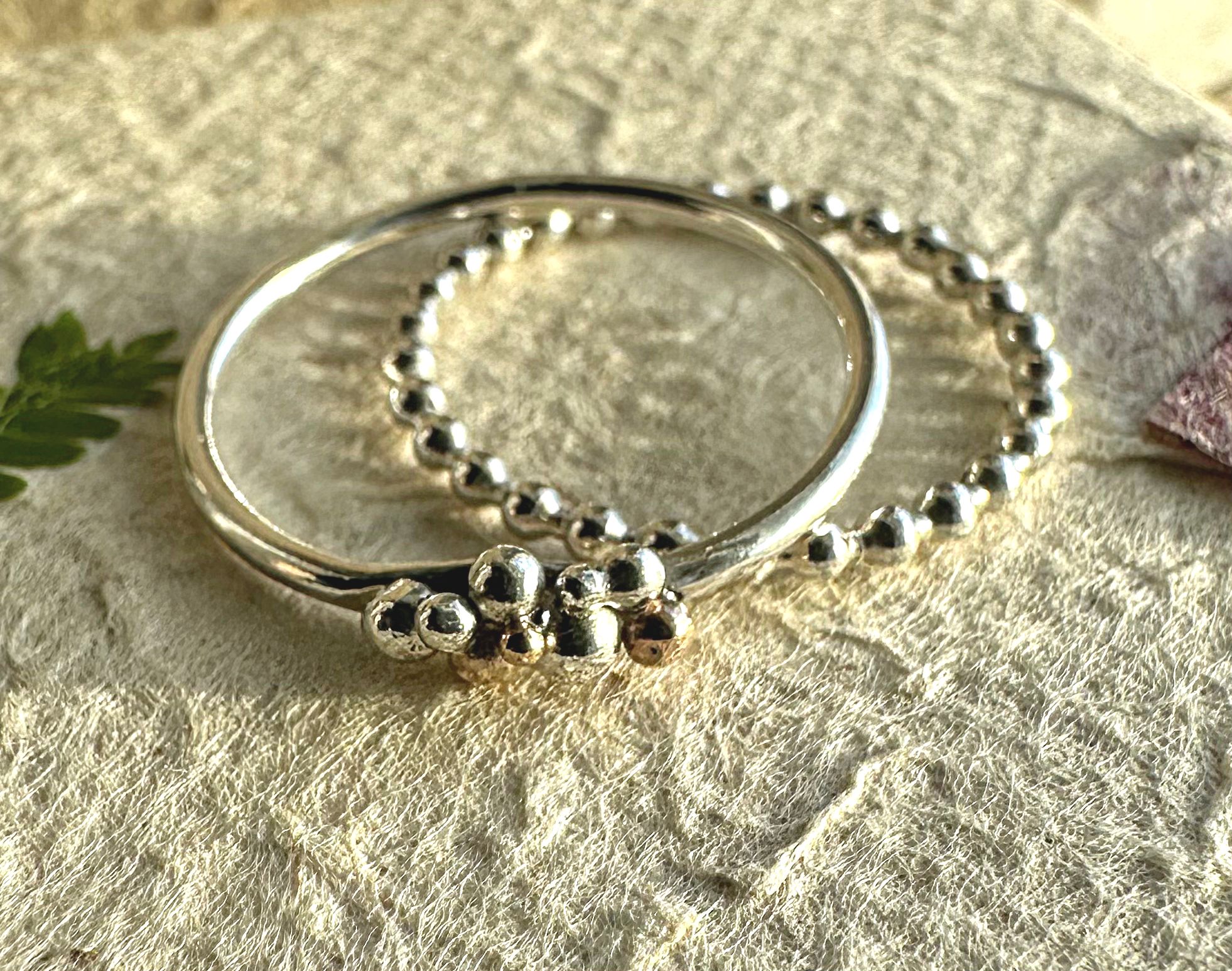 Designed for effortless everyday elegance, this sterling silver stacking set pairs two complimentary textures for a refined, modern look. One band is finished with a smooth high shine silver band adorned with silver and 9ct gold granulation, while the other is formed from a delicate row of polished silver beads. Worn together, they create a beautifully balanced mix of simplicity and detail; worn separately, each ring stands perfectly on its own. Hand-finished for a bright lasting shine, these rings are lightweight, comfortable, and ideal for stacking with your existing favourites. A timeless choice for women who appreciate subtle luxury and versatile style. Metal: Sterling Silver with 9ct gold granulation Sizes: K – T